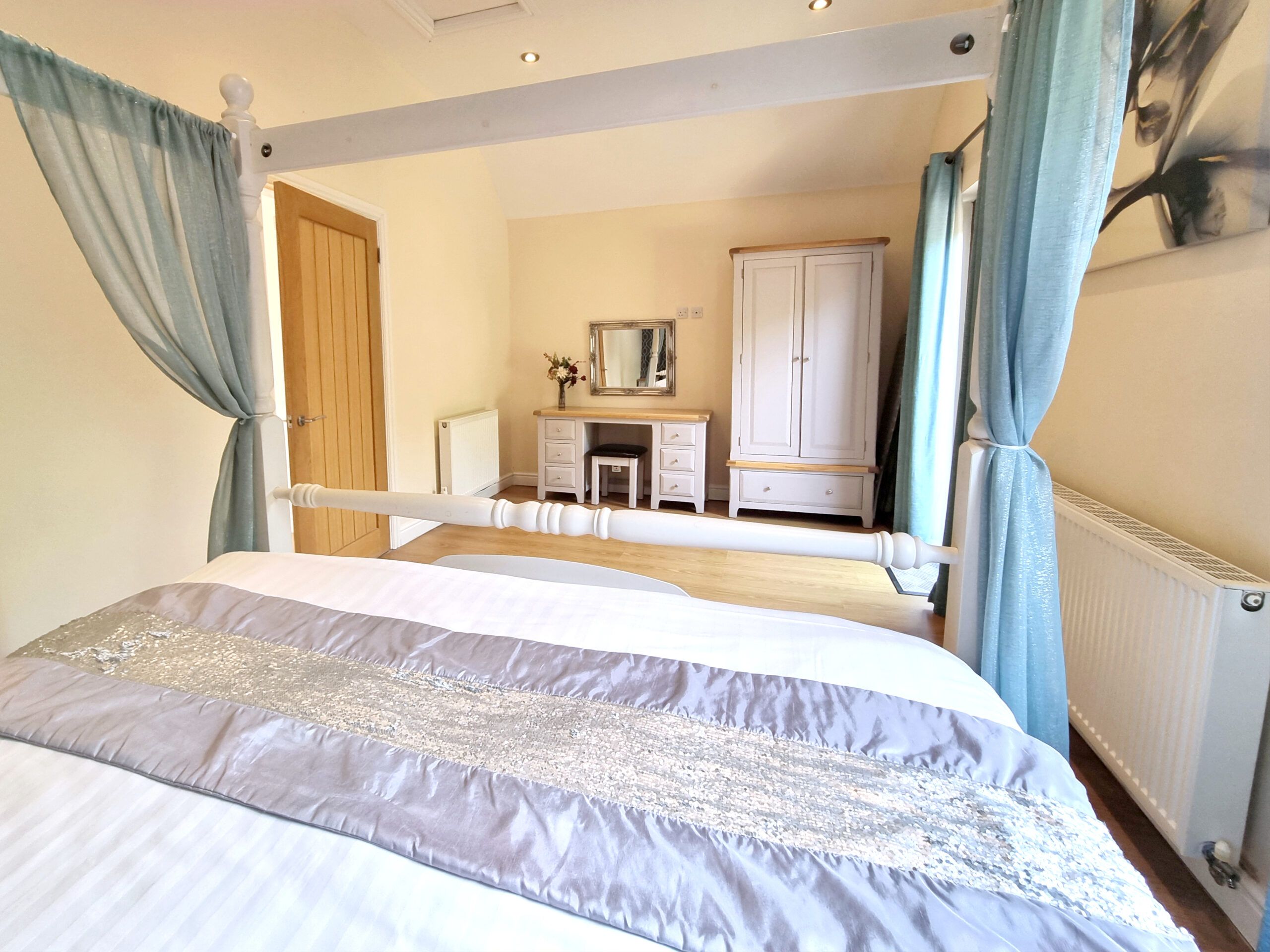 The Bedroom has a Super-King size four poster Bed and an en-suite Bathroom compromising of a Shower over Bath.